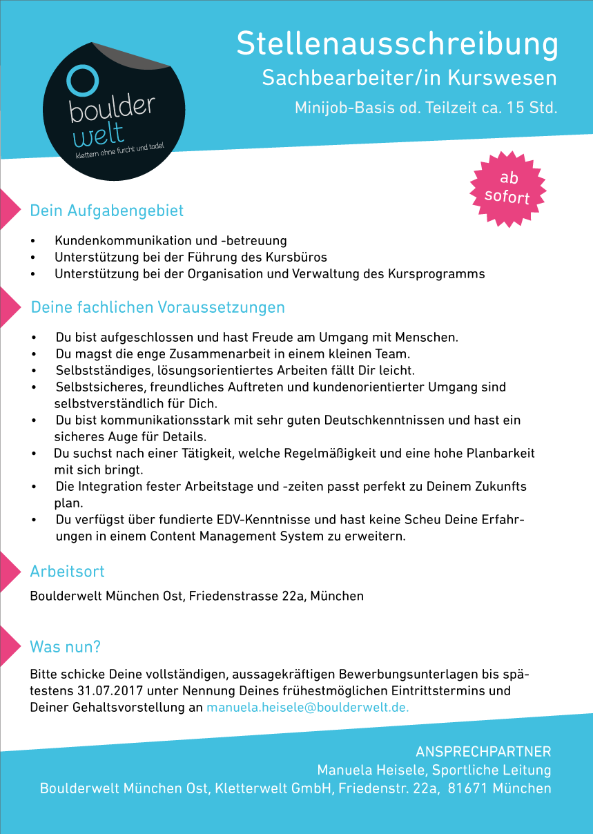 Lust für die Boulderwelt in München zu arbeiten? Unser Kursbüro sucht nach Verstärkung.