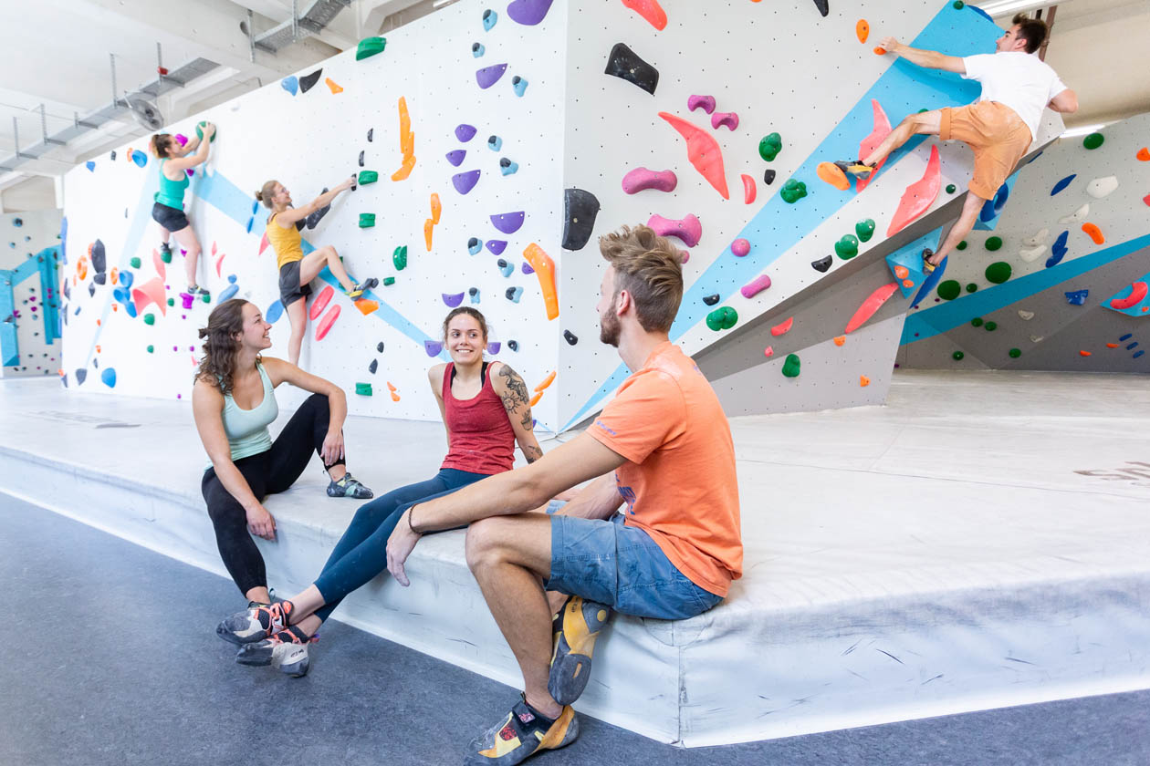 Bouldern und Klettern mit Freunden bei einer Session in der Boulderwelt München West